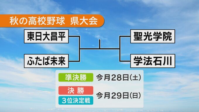 25日でベスト4が出そろい、準決勝は東日本国際大昌平とふたば未来、そして、夏の大会決勝と同じ聖光学院と学法石川が激突します。準決勝は28日、3位決定戦と決勝は、29日にあいづ球場で行われます。