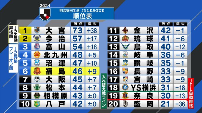 サッカー明治安田J3リーグの福島ユナイテッドFCは6日、FC岐阜と対戦。両チーム合わせて7ゴールが飛び出す試合を制し、昇格プレーオフ圏内を維持しました。