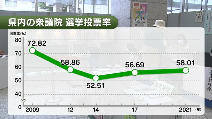 この低い投票率の中で、年々存在感が増しているのが「期日前投票」です。総務省によりますと、前回、3年前の福島県内の衆院選では、投票者の42%あまりが期日前投票を行っていました。これは全国平均も8%ほど上回っていて、県内では期日前投票が積極的に利用されていることが分かります。
