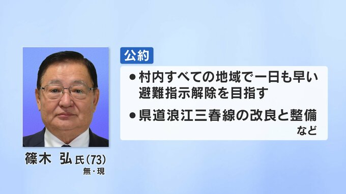 篠木さんは、村内全ての地域で一日も早い避難指示解除を目指すことや、県道浪江三春線の改良と整備などを公約に掲げていました。篠木さんの任期は、11月12日から4年間です。
