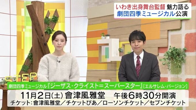 この演目は、イエス・キリストがメインとなる作品ですが、周りの群衆が主役とも言われている作品で、そんな群衆の動きや心の移り変わりにも注目してほしいとのことです。11月2日(土)に会津若松市で上演される劇団四季ミュージカル『ジーザス・クライスト=スーパースター』エルサレム・バージョンのチケットは、会場の會津風雅堂をはじめとした各プレイガイドで販売中です。