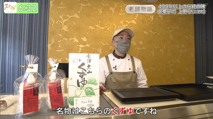 「名物はこちらのくずゆですね。地元の大山祇神社のご神饌(しんせん)としても使われている。創業当時から販売している。」