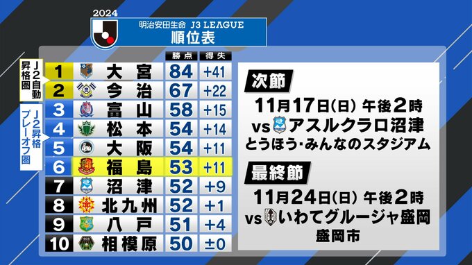 ユナイテッドは順位を1つ上げ、J2昇格プレーオフ圏内の6位に浮上。次の試合は、ホームで7位の沼津、最終戦はアウェイで最下位の岩手と対戦します。