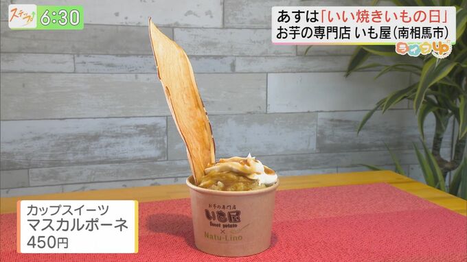 お店の中にはお芋を使ったメニューがズラリ!その中でも石焼き芋を使ったオリジナルスイーツもイチオシです。焼き芋のペーストとマスカルポーネチーズを合わせたカップスイーツ『マスカルポーネ(450円)』。