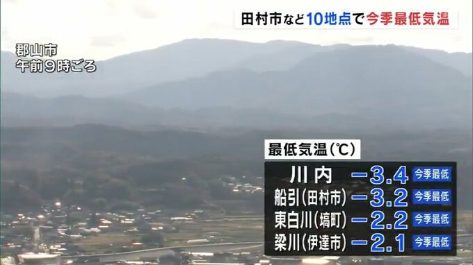 最低気温は、川内でマイナス3.4℃、田村市船引でマイナス3.2℃など、阿武隈の山あいや山間部で気温が下がり、県内10の観測地点で今シーズン一番の冷え込みになりました。