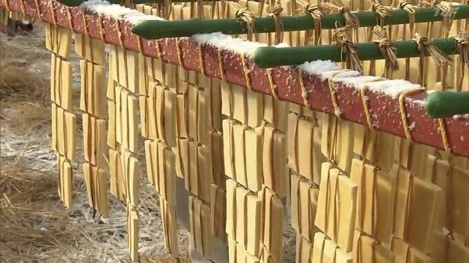 凍み豆腐は、気温が10℃以下の晴れた日に干すのが最適で、今年はこのところの天気の影響で、干す作業が例年より2週間ほど遅れましたが、出来は上々だということです。