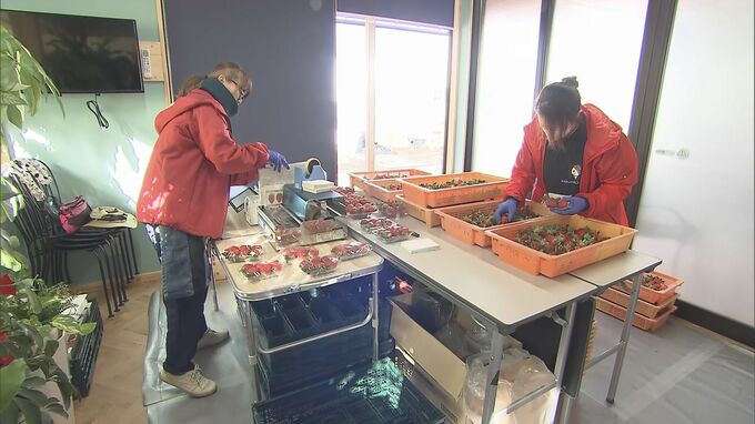 現在は、贈答用のイチゴがメインで、収穫されたイチゴは1粒1粒丁寧にパック詰めされていきました。まるなかファームによりますと、今年は猛暑などの影響で去年に比べて色づきが1週間程度遅いものの、甘くておいしいイチゴに仕上がっているということです。