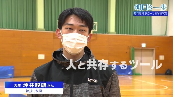 「ドローン部に入ると最新のものに触れるって環境作りですねよ。僕らだけじゃなくても、そういった社会になっていかないと、どうしても技術って発展していかないと思います。ドローンを使って3Dスキャンをしてみたり、マップを作るということを自動的にやる、いわゆるAIまで学べるっていうところで今回の取組をしているんですが、経験してなんぼかなってところですね。」