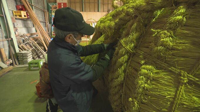 完成したのは、高さ2.5メートル、長さ4メートル、重さ5トンの大俵で、19日、わらで編んだしめ縄を取り付ける最後の作業が行われました。