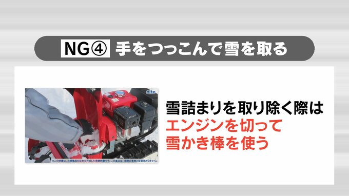 最後に、④「手を突っ込んで詰まった雪をとる」ということです。エンジンをかけたまま、手で雪を取り除こうとすると、手を負傷する恐れがあります。雪詰まりを取り除く際は、エンジンを切って、雪かき棒を使うようにしてください。