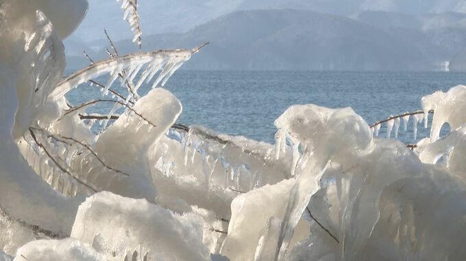 自然の芸術 猪苗代湖に「しぶき氷」出現 厳しい寒気が作り出す神秘 2024年12月31日(火) 15:25 国内 福島県の猪苗代湖では、厳しい寒さが作り出す自然の芸術「しぶき氷」が姿を表しました。猪苗代湖の「しぶき氷」は、冷たい湖の水が強風で飛ばされ、舞い上がったしぶきが、湖畔の樹木の表面などで凍ることでできる…