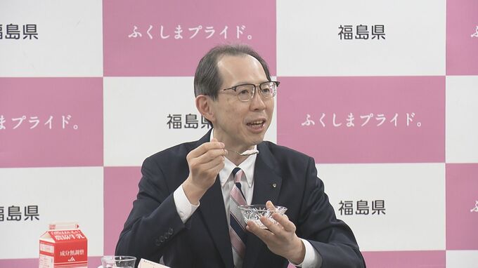 内堀知事「やっぱり甘い、香りがすごい。それに加えてフルーチェの良さ、優しいプルプルっとした食感、この3つが合わさっています」