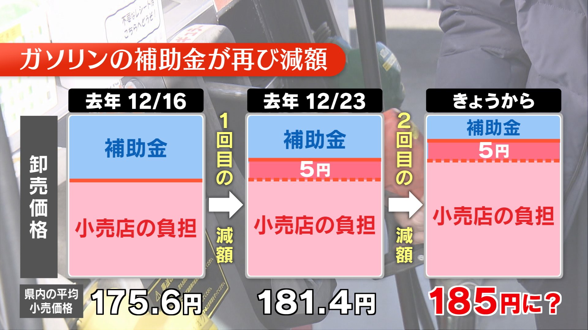 コロナ禍と物価高をきっかけに、22年から継続されてきたガソリンの補助金は、去年12月から段階的に縮小されています。実際、去年12月の1回目の減額の後、福島県内のレギュラーガソリンの平均価格は5.8円値上がりしました。さらに、1月16日からこの補助金が再び5円減額されるので、ついに185円を超える見込みとなっています。