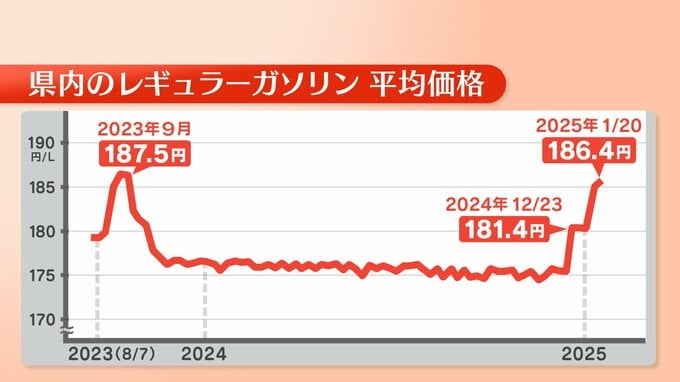 福島県内のレギュラーガソリン価格の推移をみると、2023年9月にも、ロシアのウクライナ侵攻などの影響で、1リットルあたり187.5円と185円を超えていました。その後は、政府の補助金の効果でしばらく175円台に抑えられていましたが、去年12月から、この補助金が段階的に減額され、また上がり始めました。