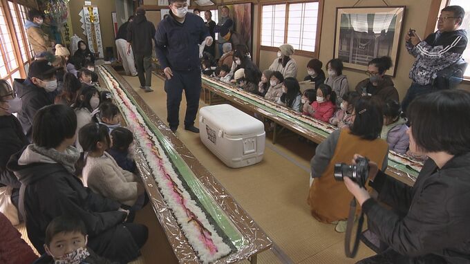 社務所では、訪れた子どもたちが相馬産のノリを使った長さ7メートルの恵方巻を作り、訪れた人たちに振る舞いました。