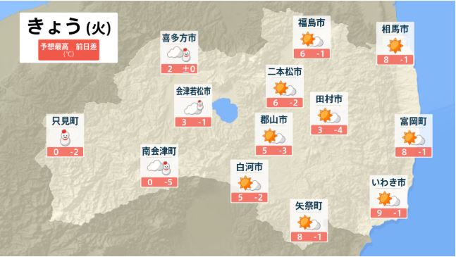 この冬一番の寒気が流れ込む影響で、福島県内では会津で、4日(火)夕方から大雪となる所がある見込みです。気象台では、交通障害などに警戒するよう呼びかけています。