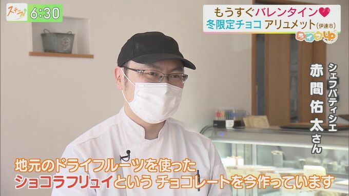 --赤間佑太さん(シェフパティシエ)「地元のドライフルーツを使った“ショコラフリュイ”というチョコレートを作っています。」