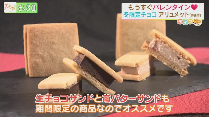 苺バターサンド(1個420円)は、伊達市産のイチゴを使ったバタークリームをしっとりとしたクッキーでサンド。イチゴの甘さとバターのコクを感じるフレッシュなおいしさは、バレンタインにぴったりです。生チョコサンド(1個420円)はオレンジリキュールで香り付けした生チョコが少し大人の味わいで、一度食べたら忘れられないおいしさです。
