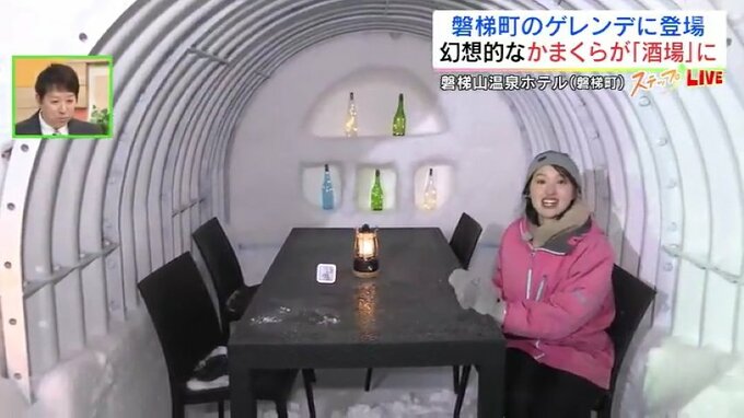スキー場なのでスキーが楽しめるのはもちろん、夜になると、「かまくら」の中が酒場になった、その名も「雪ん中酒場」が楽しめるんです。1月30日にオープンしました。