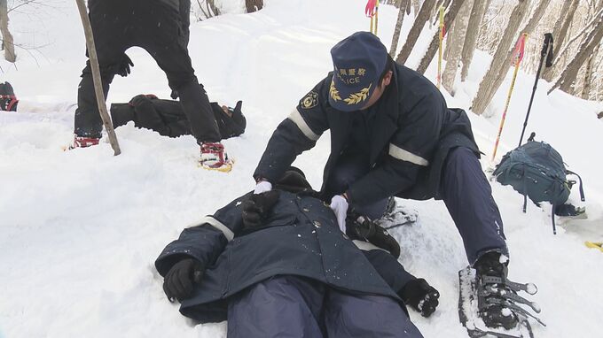 訓練は、登山者の男性が遭難したという想定で行われ、警察官たちは、雪深い山を登りながら、要救助者の捜索を行いました。そして、救助ポイントに到着すると救助方法の手順を確認しました。