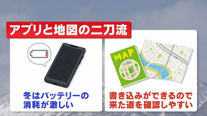 そして、おすすめなのが紙の地図とスマホのアプリを併用するということです。冬の場合、スマホのバッテリーの消耗が激しく、使えなくなってしまうというリスクがあります。そして、紙の地図の場合、書き込みもできるので、今まで来た道を確認しやすいというメリットもあります。