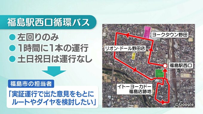 今回は「左回りのみ」のため、目的地まで1周回らないといけないという不便な点も現状ではあります。さらに、現状は平日の午前9時半から午後3時半まで、おおむね1時間おきに1本ずつ、計6便の運行で、土日祝日は運行はありません。福島市の担当者は「実証運行で出た意見をもとに、ルートやダイヤを検討したい」と話していました。