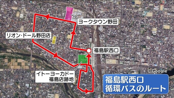 循環バスは、福島駅西口から出発し、スーパーヨークベニマルが入る「ヨークタウン野田」の前などを通り、再び駅の西口に戻ります。このルートでは、ヨークタウン野田に加えて「リオン・ドール野田店」と、2か所のスーパーの近くを通るので日、常的な買い物の移動手段としての利用が見込まれています。