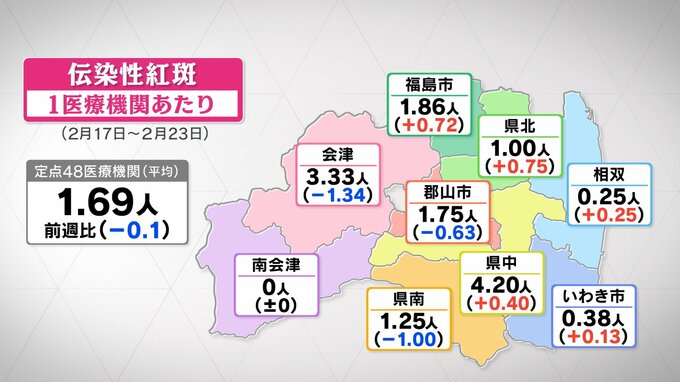 地域別では、県中が4.20人と最も多く、次いで会津が3.33人、福島市が1.86人などとなっています。リンゴ病は発熱後、頬や手足などに赤い発疹ができるウイルス性の感染症で、子どもを中心に感染しますが、妊婦が感染した場合は流産などに繋がるおそれもあります。