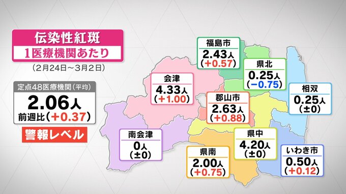 県によりますと、3月2日までの1週間に県内48の医療機関で確認された伝染性紅斑いわゆるリンゴ病の感染者数は1医療機関あたり2.06人と、前の週から増加し、警報レベルとなっています。