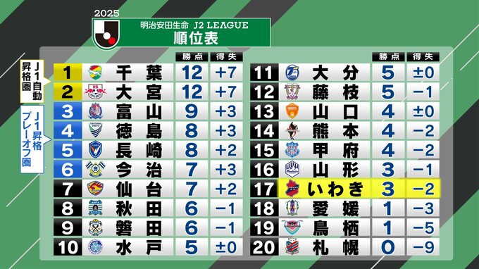 いわきは順位を1つ落として17位に後退しました。開幕4試合で未勝利と苦しい戦いが続いています。