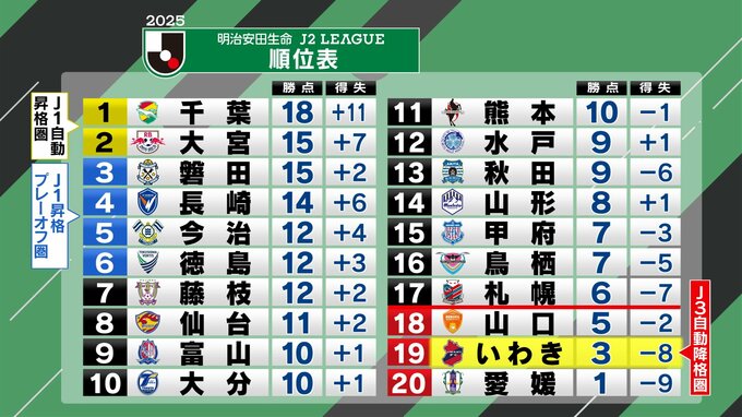 いわきの順位は変わらず、19位のまま。開幕7試合を未勝利で、J3降格圏内を抜け出せずにいます。
