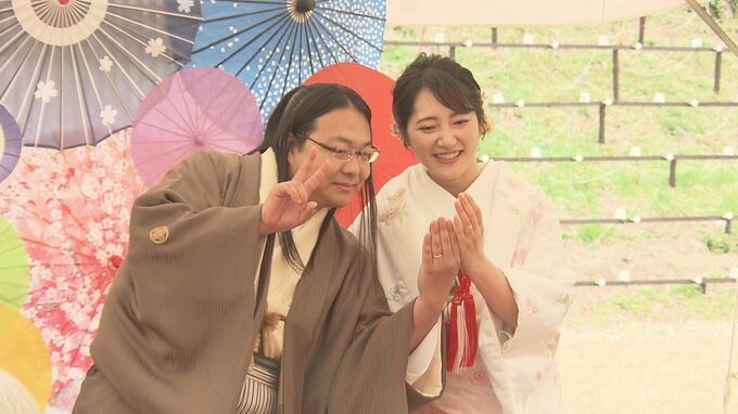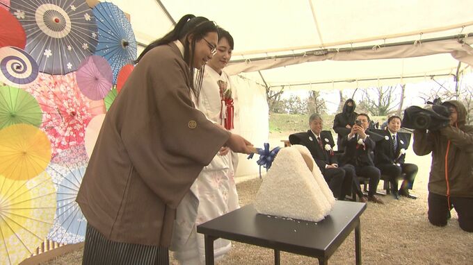 入刀されたのは、ケーキではなく「おにぎり」。そして…ハート型のおにぎりでのファーストバイト。一般の人たちにも公開する形で、「会津ならでは」の演出が行われました。人生の節目を迎えた2人は、鶴ヶ城を訪れた多くの人たちから祝福を受けました。