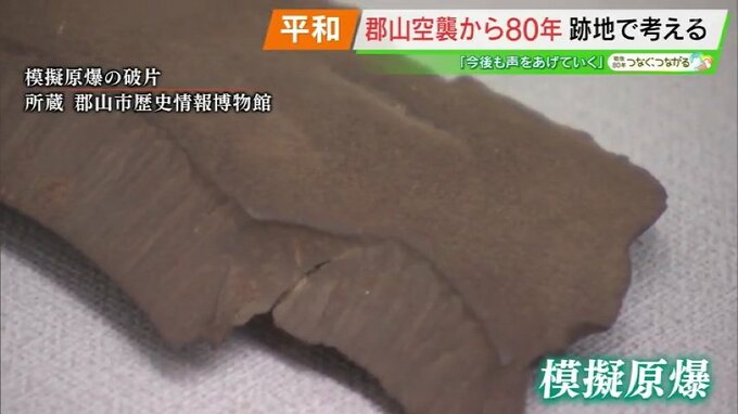 終戦の年、この空襲も含め、郡山市では、4回の空襲がありました。そのうち、7月の空襲は、8月の原爆投下と深い関わりがあります。郡山駅といまの安積黎明高校に2つの爆弾が投下されました。原爆と同じ重さや形をした「模擬原爆」です。