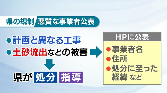 一方、県では、悪質な事業者の公表を行うことにしています。計画と異なる工事をしたり、道路や住宅に土砂を流出させたりして、県から処分や指導を受けた悪質な事業者に対して、名前や住所、処分に至ったいきさつなどを公表するというものです。