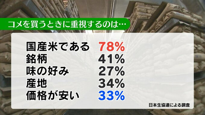 8日、日本生活協同組合連合会が、組合員を対象に「コメを買う際に、どんなことを意識しますか」と聞いたところ、77.8%が「国産米であること」と回答しました。ちなみに「価格」は33.1%で、価格の高騰でコメの輸入が活発になる中でも、国産へのこだわりが強いことがわかりました。