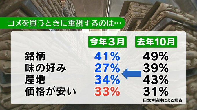 一方で、気になるデータも示されました。去年の調査と比較すると、上位を占めている「銘柄」や「産地」、「味の好み」が減少しています。