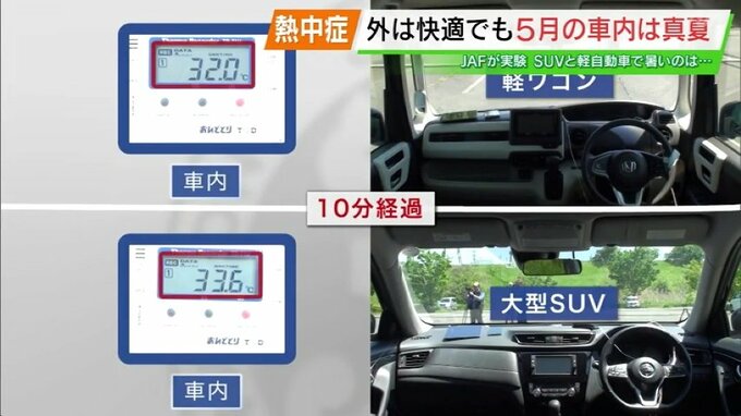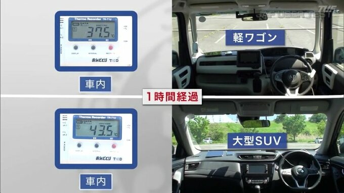 SUVと軽自動車、暑くなるのはどっち?5月でも車内は“灼熱”に… 2025年5月15日(木) 13:12 国内 わずか10分で30℃を超え… 25℃からスタートし、10分で30℃を超えました。 気温はぐんぐん上昇し、30分でSUVの方は、ほぼ40℃に達しました。そして1時間後。軽自動車は37.5℃、SUVは6℃高い43.5℃まで上昇しました。