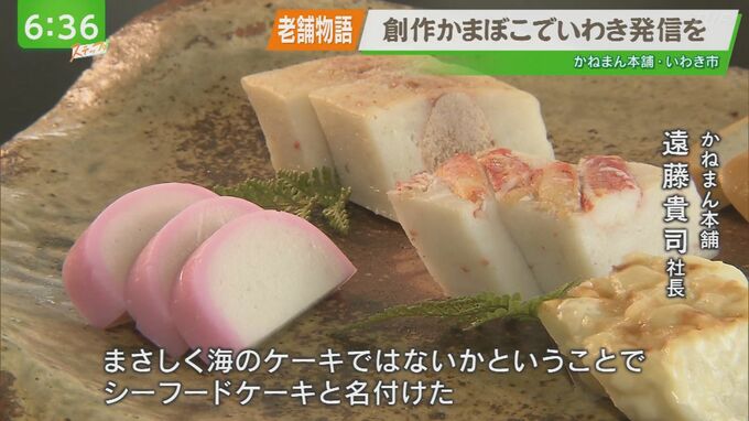 --遠藤貴司社長「この貴重な魚肉たんぱくの栄養源を、若い人にも食べてほしいということで、目で見て楽しめるようなかまぼこにしたいということで、まさしく“海のケーキ”じゃないかということで“シーフードケーキ”と名付けました。」