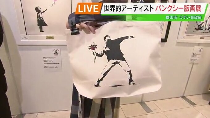 「バンクシー版画展」は、郡山市のうすい百貨店で5月26日(月)まで開かれていて、Tシャツやトートバッグなどのグッズも販売しています。