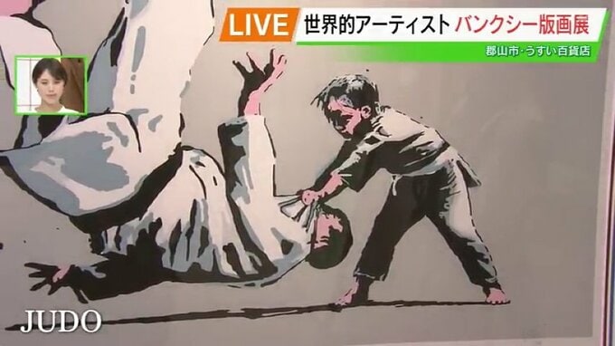 アートアドバイザーの上段博さんによりますと『JUDO』は、2022年にバンクシーがウクライナの戦地に出向いて7作品描いたうちの1作品で、少年が柔道愛好家のプーチンを投げ飛ばす、小国が大国を投げ飛ばすというメッセージになっています。