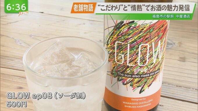 こちらは先ほど信幸さんに紹介してもらった「GLOW ep08(ソーダ割)」(500円)というお酒。ピーチなどのフルーティーな香りで飲みやすい焼酎です。