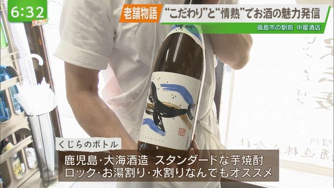--田中信幸さん(中屋酒店 三代目代表)「こちらも鹿児島の大海酒造さん、“くじらのボトル”といいます。スタンダードな芋焼酎ですが、ロック・お湯割り・水割り、それぞれおいしくいただけます。」