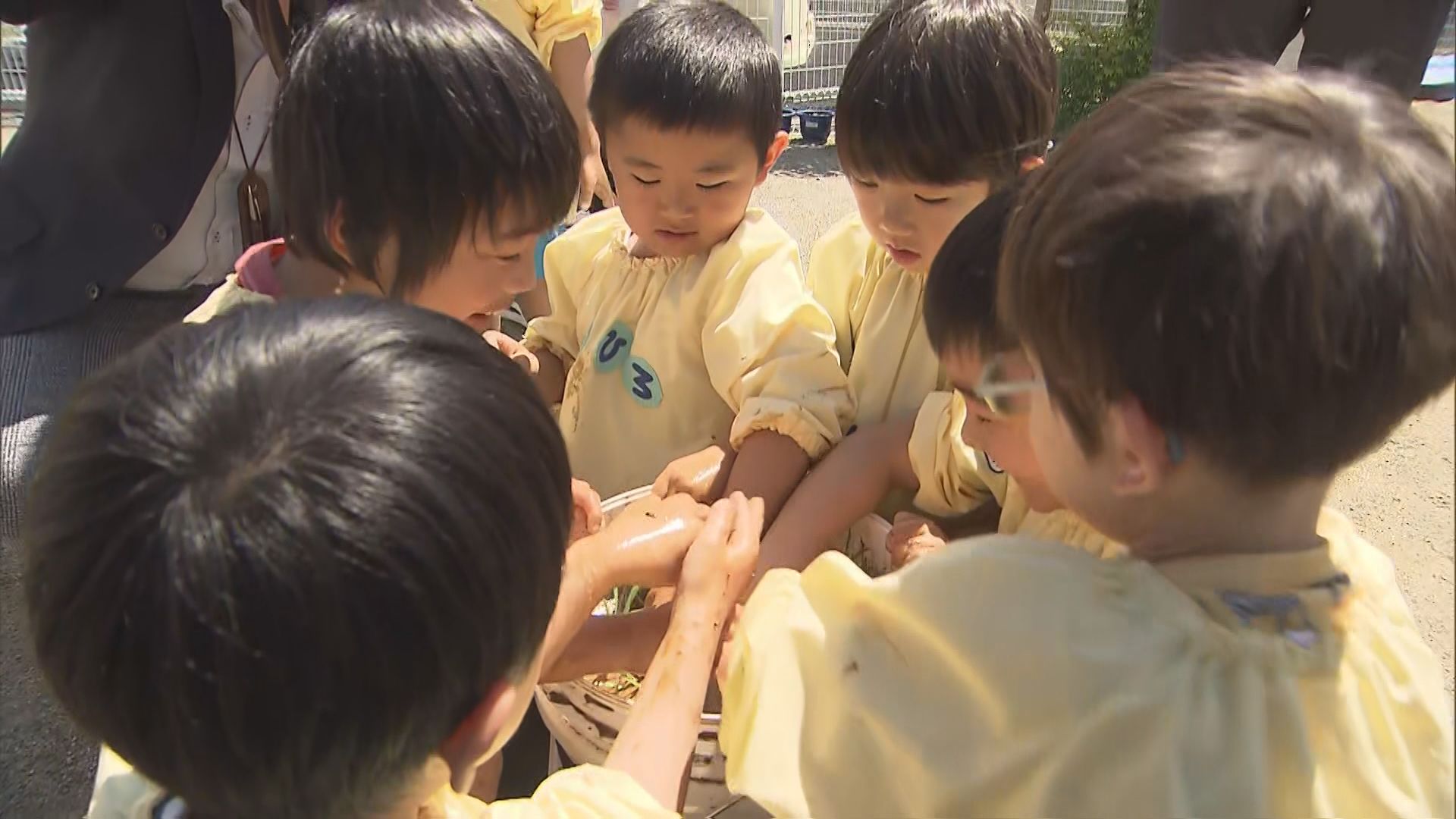 湯川村の幼稚園で園児が体験したのは、バケツを使った稲の苗植え。コメ作りを通して食の大切さを学んでもらおうと、今年からバケツ稲づくりに取り組んでいます。