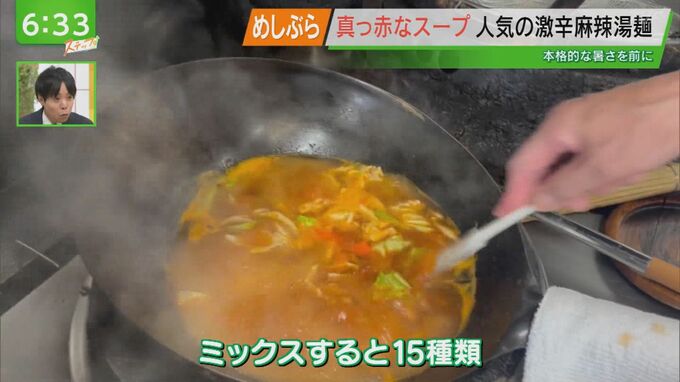 鶏ガラや豚骨などからとった濃厚な出汁に、エビやキノコ・野菜とたっぷりの具材が入っています。そして使っている唐辛子の数は・・・