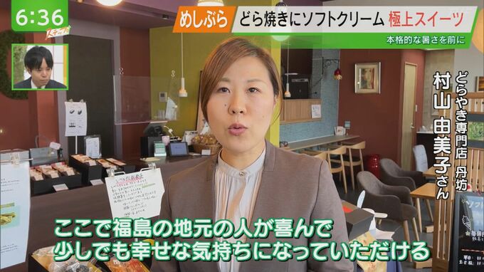 --村山由美子さん(どらやき専門店 丹坊)「震災の影響を受けて売り上げが厳しかったときに、ここで福島の地元の人が喜んでいただけて、少しでも幸せな気持ちになっていただけるお菓子づくりをしたくてどらやきをスタートしています。」