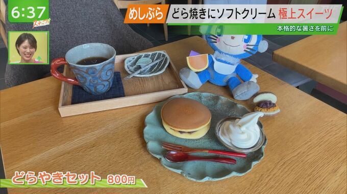 そしてもう一つ人気なのがこちらの「どらやきセット(800円)」。お好みのどら焼きを選べ、コーヒーとソフトクリームもつくお手頃セットです。今回私は、落花生どら焼きを選びました。