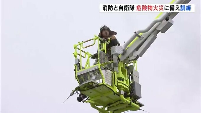この取り組みは、8日から始まった「危険物安全週間」にあわせて行われ、消防と自衛隊から、およそ60人が参加しました。訓練では、けが人を救助して手当を行い、搬送する手順を確認しました。また、消防のはしご車や自衛隊のポンプ車など10台の車両も加わり、連携して消火にあたりました。