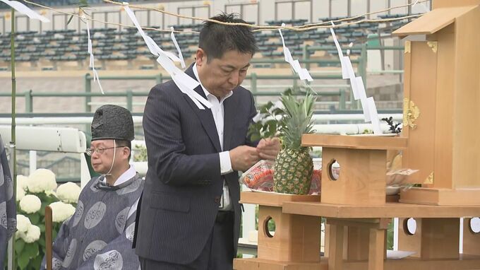 福島市のJRA福島競馬場では、28日に夏の福島競馬が始まるのを前に、25日、人馬の安全を祈る馬場浄めが行われました。芝コースでは、4月に行われた春の開催の後に傷んだ部分の張り替えが行われ、生育は順調で良い状態だということです。