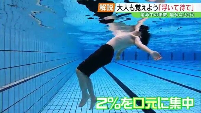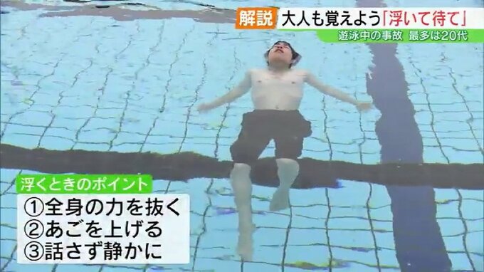 井上和樹アナウンサーが、プールで実際に「浮いて待つ」体験をしました。