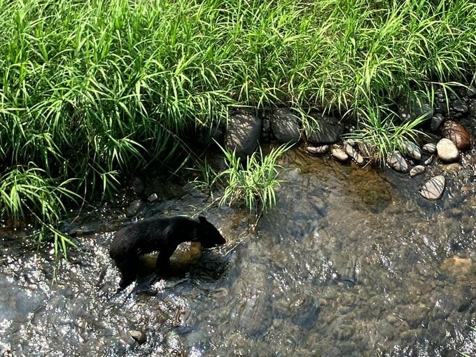 川の中で動く黒い物体。体長1.5メートルほどのクマです。